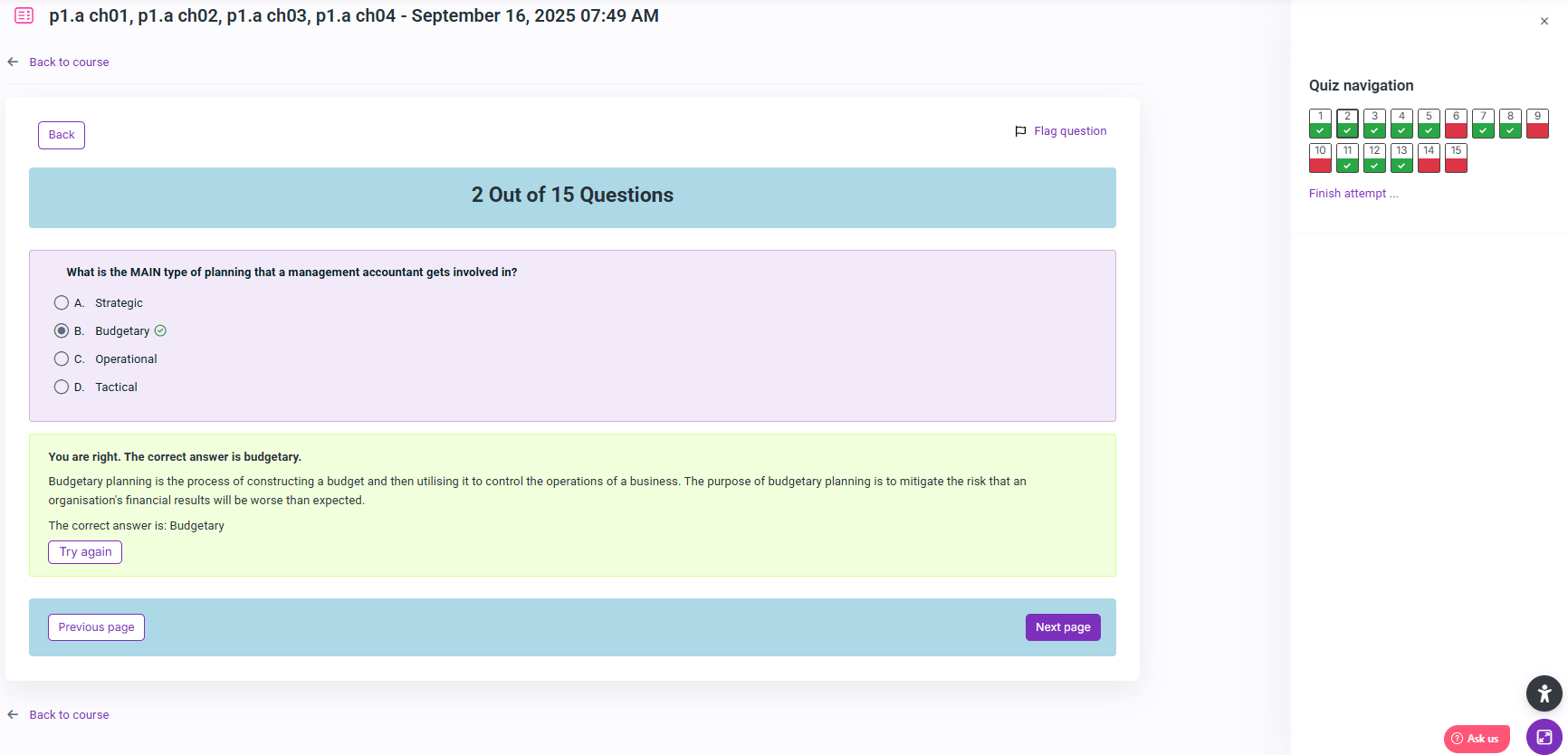 Therefore, we have developed a CIMA computer-based P1 practice questions bundle containing over 600 professionally-written questions based on the chapter structure of the Kaplan book. You will receive detailed feedback following each question, which will help you comprehend why a particular answer is correct and improve your performance. You can use feedback to establish goals and monitor your improvement progress. If you have difficulty comprehending the feedback or if you require additional information, you can use the “ask-a-tutor” icon to obtain it. This can help you clarify any misconceptions and gain a deeper understanding of the subject.