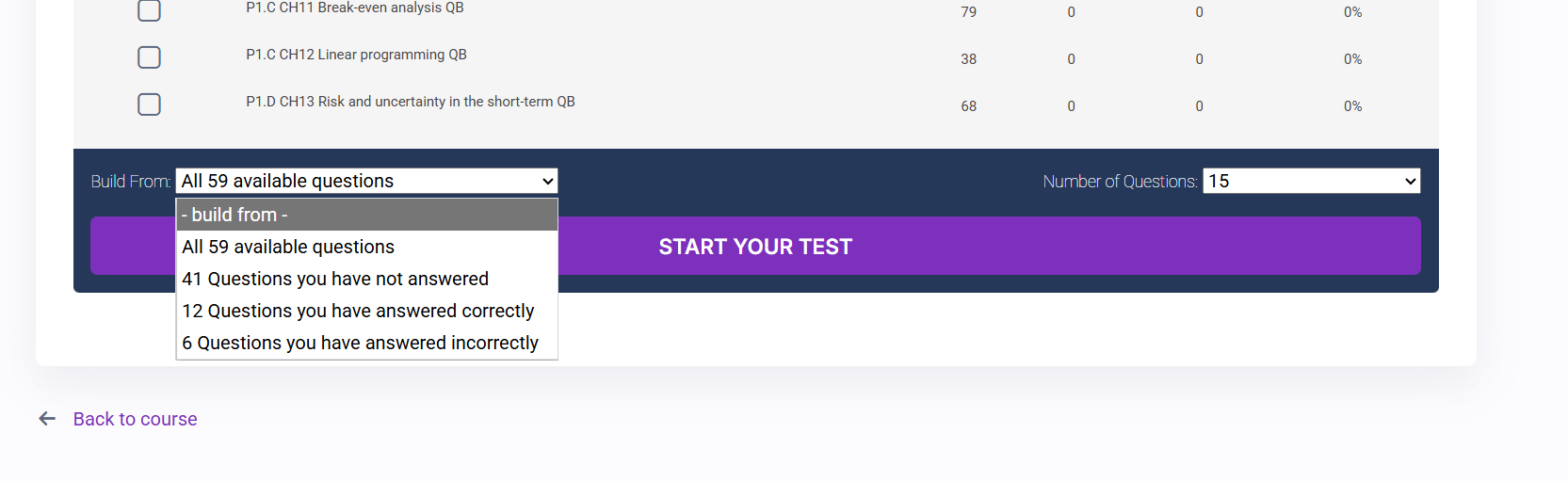 Personalised practice sessions – by selecting specific chapters and the number of questions to answer, you can customise your own practise session. Additionally, you can choose to practise only new questions or your incorrectly answered questions. This feature customises your educational experience to your specific needs.